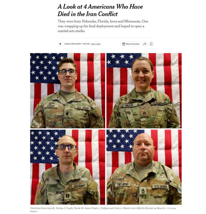 中新网3月4日电 据美国《纽约时报》网站报道称,6名美军官兵在美国对伊朗军事行动中丧生,3日晚间,联邦官员公布其中四名遇难者身份,称他们均为陆军预备役军官,在科威特舒艾巴港遭遇无人机袭击时遇难。事件仍在调查中。